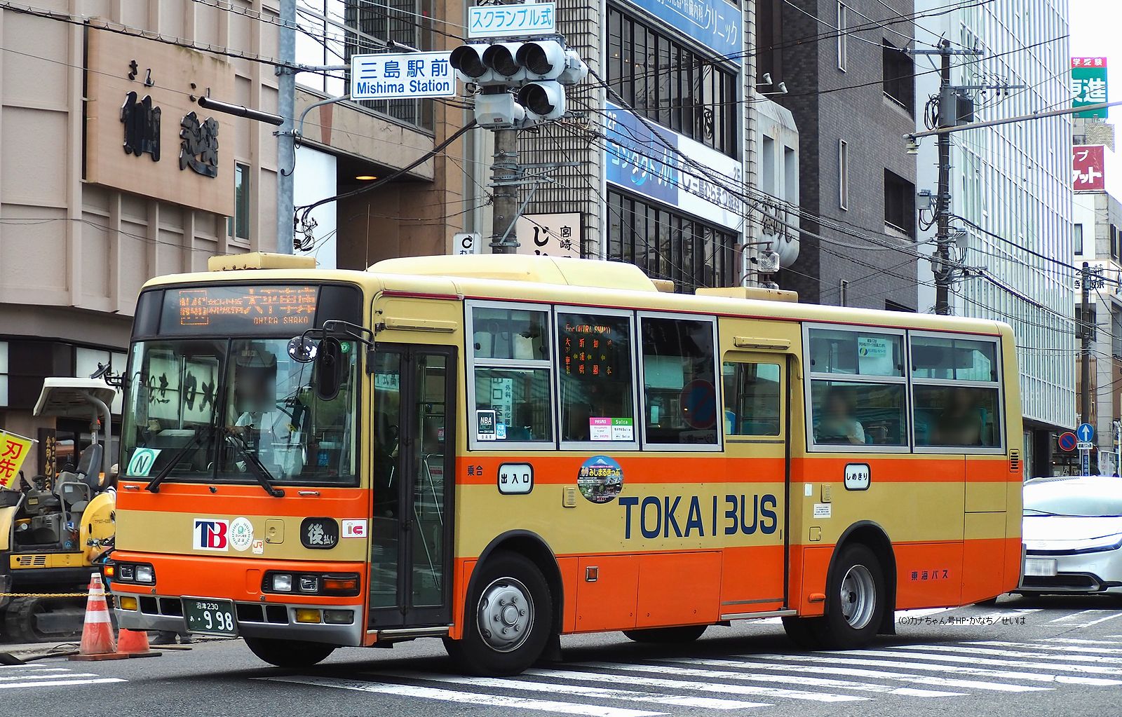 2000年11月投入の三菱KK-MK23HJです。 2013年9月に移籍したツーステップのエアロミディで東海バスへは1台のみが移籍しています。後払い表示の運賃幕も健在で、神奈中時代の面影をよく残しています。 写真は三島駅〜大平車庫線での記録です。撮影 せいは様
