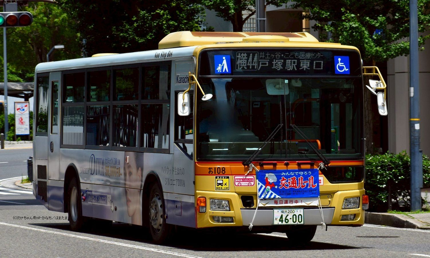 2012年8月に登場した『アドベル「かなch.」』のラッピングです。戸塚は2010年式の三菱PKG-MP35UM改(と67)ノンステップバスに施されています。縁なしタイプでは無いため見づらいですがリア窓にもKanachuロゴが張られています。2024年6月まで見られました。撮影 ま51様 |
